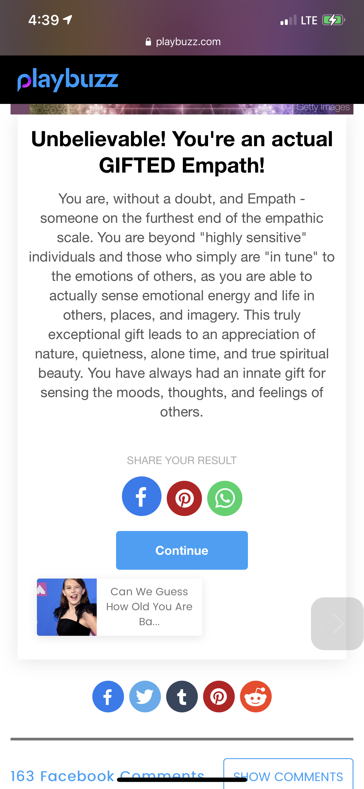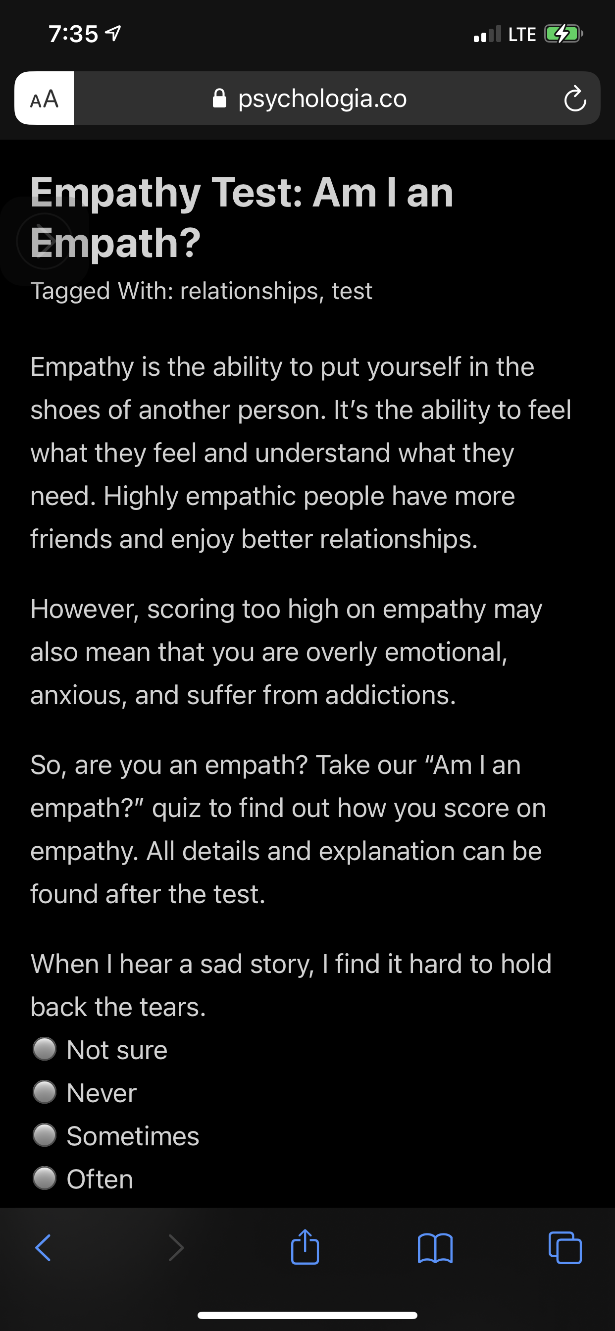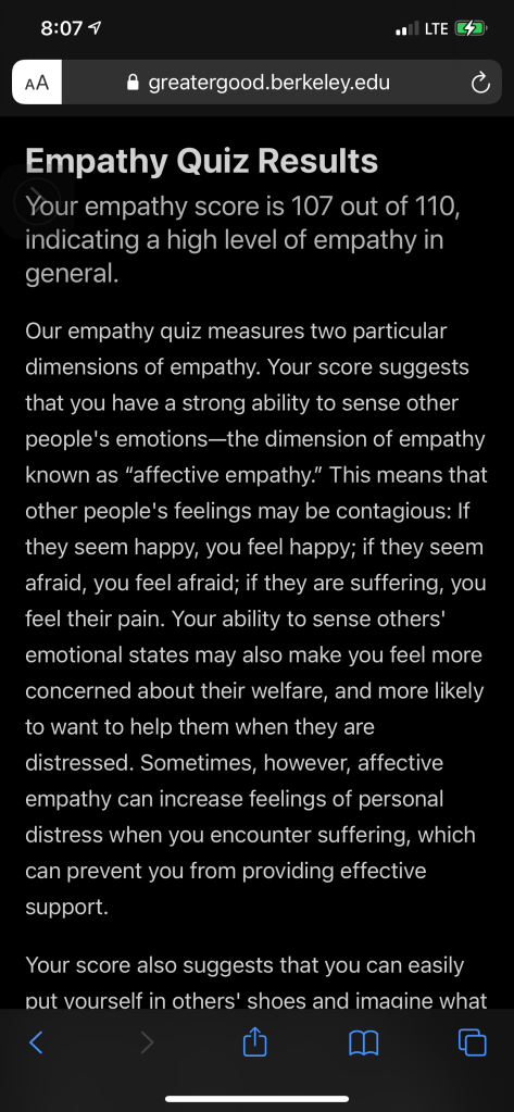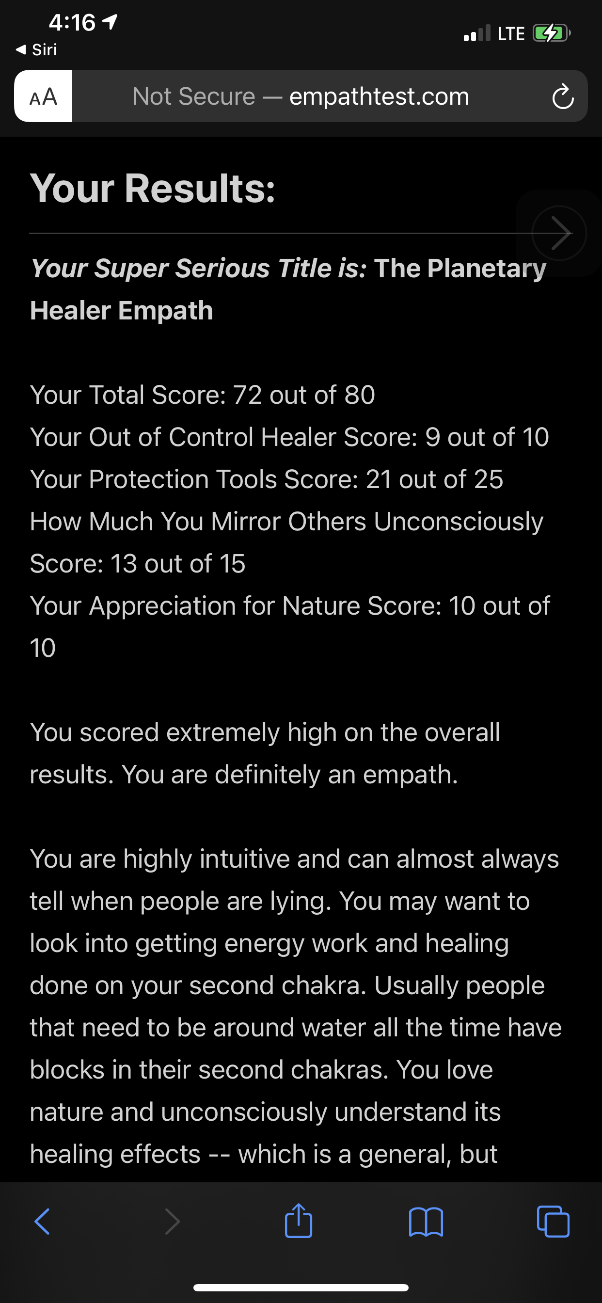 You scored pretty low on the “Has Protection Tools” section of the quiz. Yikes! You need to learn some empathic protection tools! Starting with an aura mirror! You are so caring and loving that you put others before yourself — to your detriment. You are most likely an out of control healer. You would benefit from energy work and empath tools for releasing guilt and responsibility.
