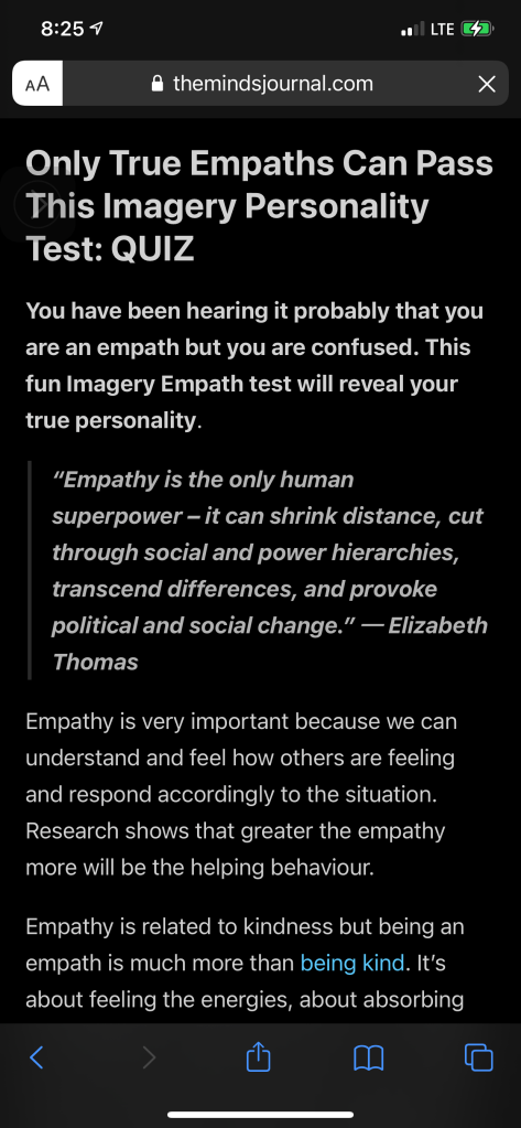 I’ve known that I was an empath within the last 5-6, after starting this srlf-discovery journey. It’s always been there, but now I can name it, and know I’m not alone. I am very sensitive, highly attachment to loved ones, and caring strongly for everyone (including plants and animals). People thought I was weird growing up, making me feel that too. I feel others emotions in my heart and body. I care about everyone. Some of the traits of psychological definitions of empaths don’t apply. I love connection with others it’s the best thing in the world. If I’m able to make someone feel better in some way, or heal them… I love to do that. I love helping people. I’m able to feel someone’s intentions, to feel if they are lying. (None of this appliest to a narcissist, if they are targeting me. Narcissists feel no empathy and they suck their house out of others. Empaths are like a yummy fish and they are the shark. They hide their true self well and can charm anyone.)